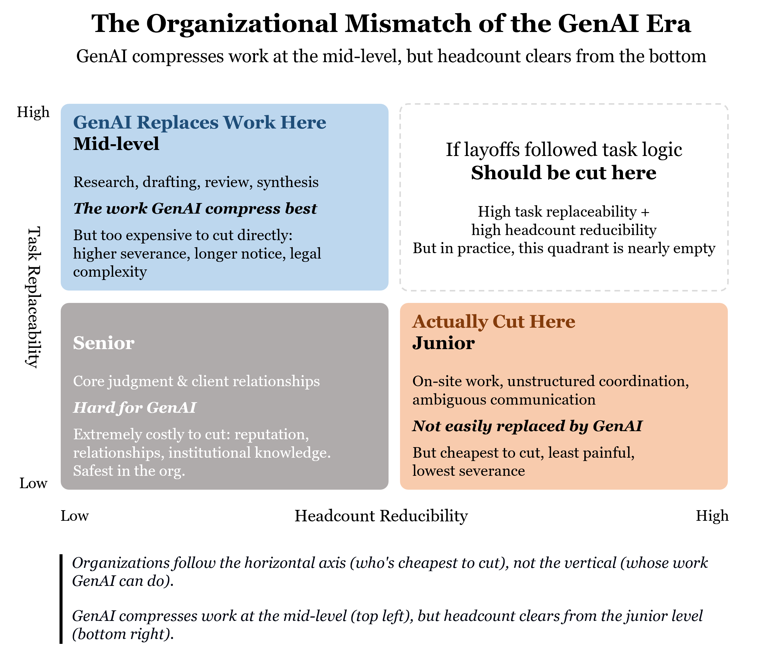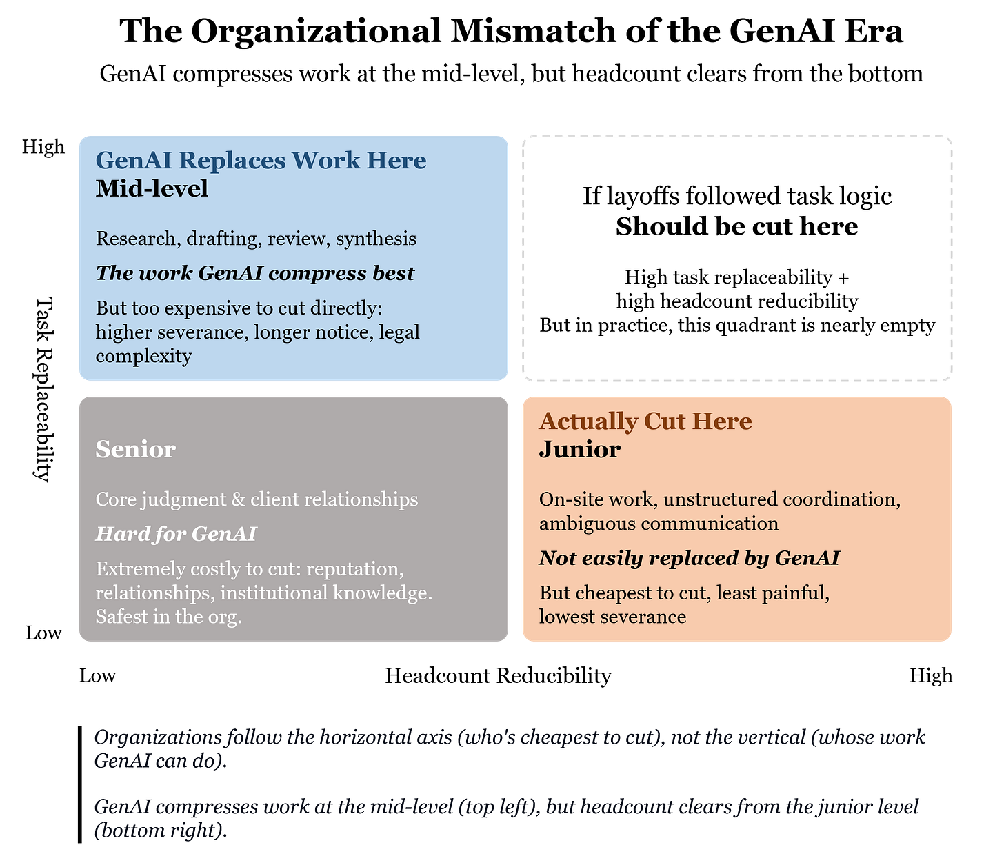 Organizations follow the vertical axis (who’s cheapest to cut), not the horizontal axis (whose work GenAI can actually do). The work GenAI actually compresses sits at the mid-level, but the cost clearing happens at the bottom of the pyramid.