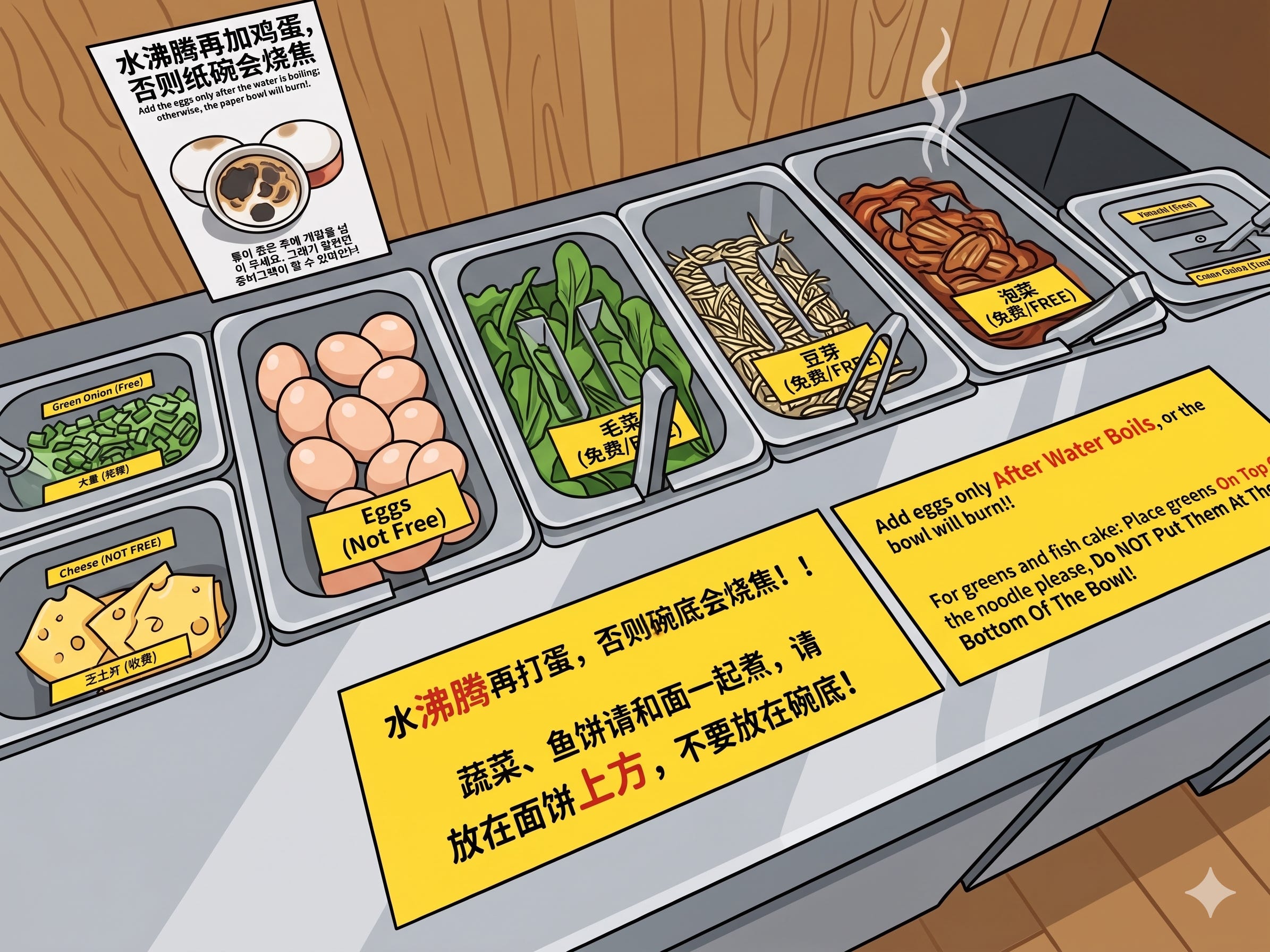 Now think about the topping station at an unmanned noodle shop. The loose cheese, vegetables, and eggs sit exposed from opening to closing, and many of these shops never close at all. Any customer, or even a non-paying passerby, could sneeze over the toppings, handle the shared tongs with unwashed hands, or do anything else while no one is watching.